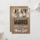 "No puedo decir "me caso" sin ti!" tarjeta moderna plana de niña de flores country rústico con efecto de arpillera marrón de fondo, elegante frasco de mason con luces de hadas, las palabras "COME, BEBE Y CÁSA'TE" y tu texto de niña de flores.