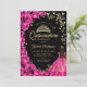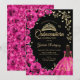 Invitación a la celebración de Quinceanera rosa y dorada de fucsia negra. Cuenta con chica de brunette en vestido de bata de bola, fuente de guión, mariposas doradas, rosas rosados calientes y tiara. Perfecto para una elegante celebración de glam al estilo de la princesa. Personaliza con tus propios detalles. Invitaciones Zazzle impresas o una plantilla imprimible digital de descarga instantánea.