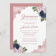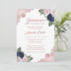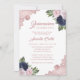 Hermosa invitación floral a la fiesta de la quinceañera con flores rosas y azules con un rosa de encaje floral dorado.