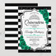 Invitación del partido Quinceanera. Diseño elegante en color verde esmeralda y purpurina de plata. Presenta rayas en blanco y negro, letra de guión, rosas, tiara y confetti. Perfecto para una elegante princesa glam estilo celebración de 15 años. Invitaciones Zazzle impresas o una plantilla imprimible digital de descarga instantánea.