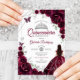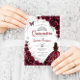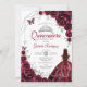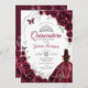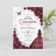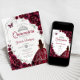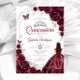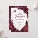 Invitación a la celebración de Quinceanera en blanco, plateado y borgoña. Características, chica de morena en vestido de bata de bola, letra de guión, mariposas, rosas de acuarela y tiara. Perfecto para una elegante celebración de glam al estilo de la princesa. Personaliza con tus propios detalles. Invitaciones Zazzle impresas o una plantilla imprimible digital de descarga instantánea.