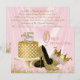 Invitaciones de Quinceañera rosadas y doradas con hermosa torta dorada con números de diamantes, zapatos dorados con brillo de tacón alto y elegante tiara de diamantes y dorada sobre un fondo rosa y dorado. Puede personalizar fácilmente estas hermosas invitaciones de Quinceañera rosadas y doradas para su evento simplemente agregando sus detalles en el estilo de fuente y redacción de su elección. Este es un diseño impreso sin brillo real, diamantes, lazos, etc. También puede eliminar el fondo de satén y agregar el color de fondo que desee.