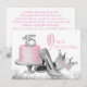 Invitaciones de Quinceañera rosadas y plateadas con un precioso pastel rosa con números de diamantes, zapatos de tacón alto con purpurina plateada y una elegante tiara de princesa con diamantes sobre un fondo rosa y plateado. Puede personalizar fácilmente estas hermosas invitaciones de Quinceañera rosadas y plateadas para su evento simplemente agregando sus datos en el estilo de letra y redacción de su elección. Este es un diseño impreso sin purpurina real, diamantes, lazos, etc. También puede agregar el color de fondo que desee.