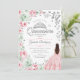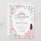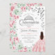Invitación de celebración de Quinceañera rosa, verde salvia y plata blanca con flores. Cuenta con una niña morena con vestido de baile, letra script, mariposas plateadas, rosas y tiara. Perfecto para una celebración elegante de estilo princesa glamurosa. Personalice con sus propios detalles. Impreso en invitaciones Zazzle o plantilla digital para imprimir instantánea.
