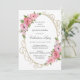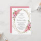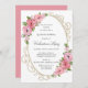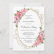 Elegante y tradicional invitación a la quinceañera floral rosa. Una moda y un adorno dorado óvalo rodean los detalles de la celebración de Quinceanera. Las rosas rosas y las peonías rosadas decoran el marco dorado. Las flores están enclavadas en hojas y viñas de color verde oscuro. La invitación de vuelta es rosa. Este artículo forma parte de la colección Bella Rosa Quinceanera. Contiene plantillas que se pueden utilizar para crear una impresionante suite de invitaciones y suministros para fiestas. Si necesita ayuda para encontrar elementos de coordinación, póngase en contacto con el