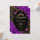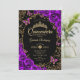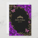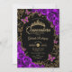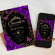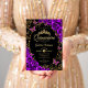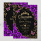 Invitación a la celebración de Quinceanera en negro, morado y dorado. Características, letra de guión, mariposas doradas, rosas de acuarela y tiara. Perfecto para una elegante celebración de glam al estilo de la princesa. Personaliza con tus propios detalles. Invitaciones Zazzle impresas o una plantilla imprimible digital de descarga instantánea.