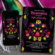 Invitación floral mexicana Quinceanera para la celebración de los 15 años de tu hija. Este tema mexicano de Quinceañera presenta coloridas flores de arte folclórico mexicano en un fondo negro, rosa, morado, rojo y amarillo. La parte trasera de la tarjeta tiene un ramo de flores de flores de la misma fiesta. La plantilla está preparada para que usted pueda personalizar la tarjeta con todos sus datos personales. Por favor, busque en mi tienda los elementos coincidentes y coordinados.