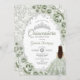 Invitación a la celebración de Quinceanera de plata verde sabia. Cuenta con chica de morena en vestido de payaso de bola, fuente de guión, mariposas plateadas, rosas de acuarela y tiara. Perfecto para una elegante celebración de glam al estilo de la princesa. Personaliza con tus propios detalles. Invitaciones Zazzle impresas o una plantilla imprimible digital de descarga instantánea.