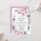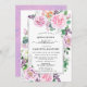 Las rosas y peonías púrpura y rosa con lilas púrpura y blanco crean un marco exuberante en esta invitación de Quinceañera. La parte trasera es una textura de acuarela rosa y púrpura única con solo el indicio de contornos de rosa. Todo el texto se puede editar fácilmente para crear un recuerdo personal.