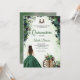 Quinceañera invitation card featuring a girl in a green dress facing away, surrounded by green floral accents, with a rustic wagon. Elegant and celebratory.