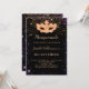Para una elegante Quinceañera, 15ª fiesta de cumpleaños temática Masquerade. Un elegante fondo negro. Decorada con polvo de purpurina de oro falso morado y una máscara dorada de máscaras. Personalice y agregue un nombre, edad y detalles del fiesta. El nombre se escribe con un guión de estilo con letras a mano