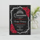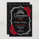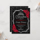 Invitación a la celebración de Quinceanera blanca y plateada. Incluye tipografía de guiones, rosas rojas, tiara y confetti. Diseño elegante con una falsa plata purpurina. Perfecto para una elegante celebración de glam.