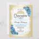 Cuenta con fuente de escritura, rosas azules aqua, tiara y confeti. Diseño de azul turquesa clásico con oro falso brillante. Perfecto para una celebración elegante y glamorosa.