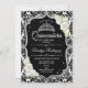 Invitación a la celebración de Quinceanera blanca y plateada. Presenta un patrón de damasco, tipo de letra de guión, rosas blancas, tiara y confetti. Diseño elegante con una falsa plata purpurina. Perfecto para una elegante celebración de glam.