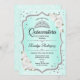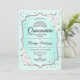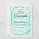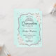 Invitación del partido Quinceanera. Elegante diseño de color turquesa y plateado. Presenta fuente de guiones, rosas blancas, tiara y confetti. Diseño elegante con un Relieve metalizado de plata falso purpurina. Perfecto para una elegante celebración de glam.