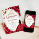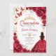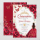 Red, gold and white Quinceanera celebration invitation. Features brunette girl in ball gown dress, script font, gold butterflies, watercolor roses and tiara. Perfect for an elegant princess style glam celebration. Personalize with your own details. Printed Zazzle invitations or instant download digital printable template.