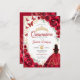 Invitación de celebración de Quinceañera roja, dorada y blanca. Características de una chica morena con vestido de gala, fuente de letra script, mariposas doradas, rosas de acuarela y tiara. Perfecto para una celebración de glamour de princesa elegante. Personalice con sus propios detalles. Impreso en invitaciones de Zazzle o plantilla digital para imprimir instantánea.