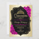 Invitación a la celebración de Quinceanera color rosa negro dorado. Presenta fuente de guiones, rosas rosados calientes, tiara y confetti. Elegante diseño rosa fucsia con falso oro purpurina. Perfecto para una elegante celebración de glam.
