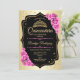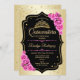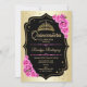 Invitación a la celebración de Quinceanera color rosa negro dorado. Incluye tipografía de guiones, rosas rosa rosa pastel, tiara y confeti. Diseño rosa rubio y elegante con oro purpurina falso. Perfecto para una elegante celebración de glam.
