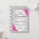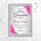 Fiesta Quinceanera - Invitación plateada. Incluye rayas, letra de guión, rosas rosas rosas rosas, tiara y confetti. Diseño elegante con un Relieve metalizado de plata falso purpurina. Perfecto para una elegante celebración de glam.