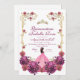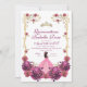 Moderna y elegante invitación rosa y dorada con un vestido rosa y rosas rojas rosadas, polvo de oro con efecto de tinta dorada (el oro es un efecto digital, ¡no un Relieve metalizado real!) y caligrafía moderna. Bonito y seña de bienvenida elegante, lujosa y moderna.