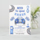 Fiesta de cumpleaños. Invite a los huéspedes a una fiesta de cumpleaños con estilo con carrera de autos. Pista de carreras acuáticas, gasolinera, bandera de la carrera, auto de carreras azul.