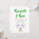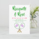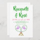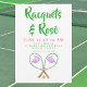 Sip, servir y celebrar con esta invitación de moda Racquets y Rosé! Cuenta con dos raquetas de tenis rosas cruzadas con cubiertas de cabezas blancas nítidas decoradas con ballenas púrpura y guarnecido verde, además de tres pelotas de tenis en el medio. El diseño de los perritos es perfecto para una noche de tenis, una fiesta de verano o una reunión en el patio de chicas. Personalizar todos los detalles de tu evento, ya sea dobles con amigos, un almuerzo para mujeres o una divertida velada con temas de tenis. Deportivo, elegante y listo para impresionar a sus invitados.