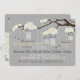 Dahlias blancas sobre la rama de un árbol sobre fondo gris con carteles de máscaras colgantes y mariposas diseño de tarjetas de invitación a la ducha de novia.