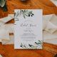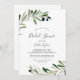 Esta moderna invitación a la ducha de novias en una rama de olivo es perfecta para una ducha de bodas. El diseño rústico y elegante presenta una sencilla acuarela de hojas botánicas verdes y aceitunas negras en una pequeña rama de ambiente mediterráneo clásico.