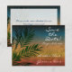 Elegantes tarjetas de invitación de save the date de colores ricos, ideales para bodas de playa, bodas en destinos lejanos y bodas en resorts de islas tropicales. Azul, amarillo y rojo al atardecer, con ramas de palmeras de color verde oscuro. Fácil de personalizar con su información de save the date en línea.