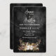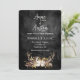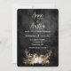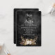 Cadena de luces brillantes en un ramo floral de cuernos de ciervo sobre cuero negro desgastado para una invitación de boda de otoño. Todo el texto es editable.