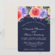 Una invitación de boda con un bonito ramo de rosas de acuarela con ramitas, hojas y ramas todas juntas en un arreglo floral colorido a lo largo de la parte superior. Fondo de color azul marino.