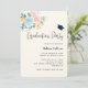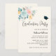 Invitación a la fiesta de graduación con una bonita ilustración de acuarela. Un ramo de flores con flores rosas y azules rodeadas de hojas verdes y ramitas. Una gorra de graduación encima del texto.