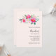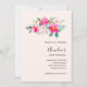 Invitación de fiesta de cumpleaños con una imagen caprichosa de acuarela. Un hermoso arreglo floral con colores rosa brillante y rosa pastel entre hojas verdes y ramitas.