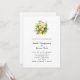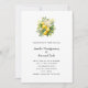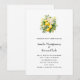 Invitación de boda con una encantadora ilustración de un ramo de limones rodeados de hojas de flores blancas y ramitas.