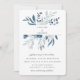 Hermoso ramo de acuarela de flores y follaje azul polvoriento y azul marino, invitación de boda. La parte posterior de la tarjeta presenta un color azul marino apagado sólido.