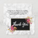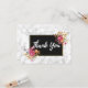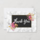 Una tarjeta de agradecimiento de boda con fondo de mármol blanco. Superpuesto en la parte superior hay un marco negro con un borde delgado de color dorado. Las esquinas están decoradas con ramos de flores rosadas. Elegante y sofisticado. La parte posterior tiene un mensaje de agradecimiento con tu nombre, que puedes personalizar o eliminar.
