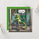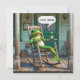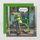 Una rana relajada se sienta en una mecedora de madera mientras sostiene una botella de cerveza en un porche rústico para una fiesta de cumpleaños.