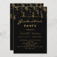 Una invitación moderna y elegante para una fiesta de graduación de 20xx. Tanto para él como para ella. Un fondo negro clásico y un fiesta dorado y negro como decoración. Personalice y agregue un nombre y detalles del fiesta. El texto Graduación y el nombre se escriben con un estilo de escritura moderno con letra a mano. Cartas doradas.