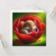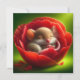 Un ratón tierno y esponjoso durmiendo pacíficamente dentro de una vibrante flor de amapola roja. Los pétalos de la flor son suaves y detallados, rodeando el ratón como una cama acogedora. El entorno está decorado con suaves tonos verdes que crean un ambiente sereno y tranquilo, con un toque de luz brillante que le da un toque mágico.