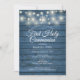 Una primera invitación rústica a la comunión sagrada con luces de cuerda de bonito y tus detalles especiales personalizados en la tipografía de moda sobre un fondo de paneles de madera azul. Diseñado por Thisisnotme©