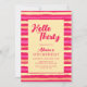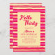 Esta invitación de cumpleaños, pintoresca, colorida y divertida, presenta un patrón impecable de rayas con colores rosa, rojo, naranja y melocotón.