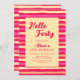 Esta invitación de cumpleaños, pintoresca, colorida y divertida, presenta un patrón impecable de rayas con colores rosa, rojo, naranja y melocotón.