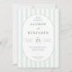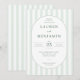 Esta elegante invitación de boda presenta un diseño clásico con rayas verticales verde claro sobre un fondo verde más oscuro, creando un aspecto fresco y sofisticado. El marco oval central destaca los detalles del evento en una fuente serif limpia, enfatizando la claridad y la formalidad. Perfecta para parejas que buscan una estética atemporal, esta invitación transmite un aire de elegancia y refinamiento, lo que la hace ideal para celebraciones formales. Su enfoque minimalista se centra en la tipografía, asegurando que toda la información esencial se presente de manera hermosa sin distracciones.