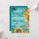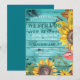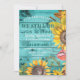 Invitaciones de renovación de votos de aniversario rústico de campo, madera turquesa y girasoles: fondo de tablones de madera de granero turquesa desgastados y con aspecto desgastado. Bordeado lateral y inferior con girasoles florales de acuarela rústica, espadañas y hojas en tonos terrosos amarillos, marrones, verdes y un toque de rojo. Dice 'We Still Do' en letra turquesa a juego, estilo western con 'Vow Renewal' debajo y el año de aniversario encima en letra curva. Los detalles de la fiesta de aniversario, incluida la información de RSVP, están debajo. La parte trasera tiene un fondo turquesa sólido a juego, que se puede cambiar a cualquier tono. Nota: Todas las imágenes se imprimen. Utilice el botón Personalizar para cambiar cualquier cosa: estilos de fuente, tamaños, colores o ubicación. Invitaciones de campo elegantes para verano u otoño, fiesta de aniversario rústica al aire libre, tema de boda de jardín y estilos de aniversario