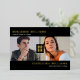 Invitaciones dobles a fiestas de graduación con un elegante fondo negro que se puede cambiar a cualquier color, fotos de los dos graduados, y una elegante plantilla de celebración de Relieve metalizado de oro real que es fácil de personalizar. NOTA: el Relieve metalizado puede cambiarse a oro plateado o rosa. Se puede ajustar la redacción de la invitación de graduación para convertirla en una invitación de graduación.