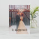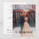 Este anuncio de boda de foto rústica recién casados y la invitación a la recepción presentan las palabras "sucedió" en tipografía rústica y desgastada sobre su propia foto y la información de la boda y recepción en el reverso, y es la tarjeta perfecta para anunciar su fuga. Fácil de personalizar con su propia foto y texto. Perfecto para la recepción que se celebra en un granero de bodas, boda al aire libre o lugar de boda en una granja.