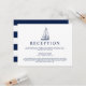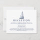 Tarjetas de invitación de recepción con tema náutico que presentan un barco de vela de estilo vintage y un fondo a rayas blancas y azul marino en el reverso.