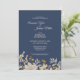 Esta invitación de recepción de boda bohemia de otoño azul polvoriento combina un ambiente antiguo con una apariencia de flores silvestres bohemianas retro. Las elegantes flores silvestres beige neutras sobre el fondo azul polvoriento y azul marino, con su tipografía caligráfica clásica, permiten un tema de celebración de matrimonio formal pero salvaje y floral, de estilo vintage.
