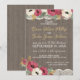 Madera de granero y encaje, invitación rústica de barbacoa floral borgoña para una barbacoa de "Te Amo" o recepción casual.
